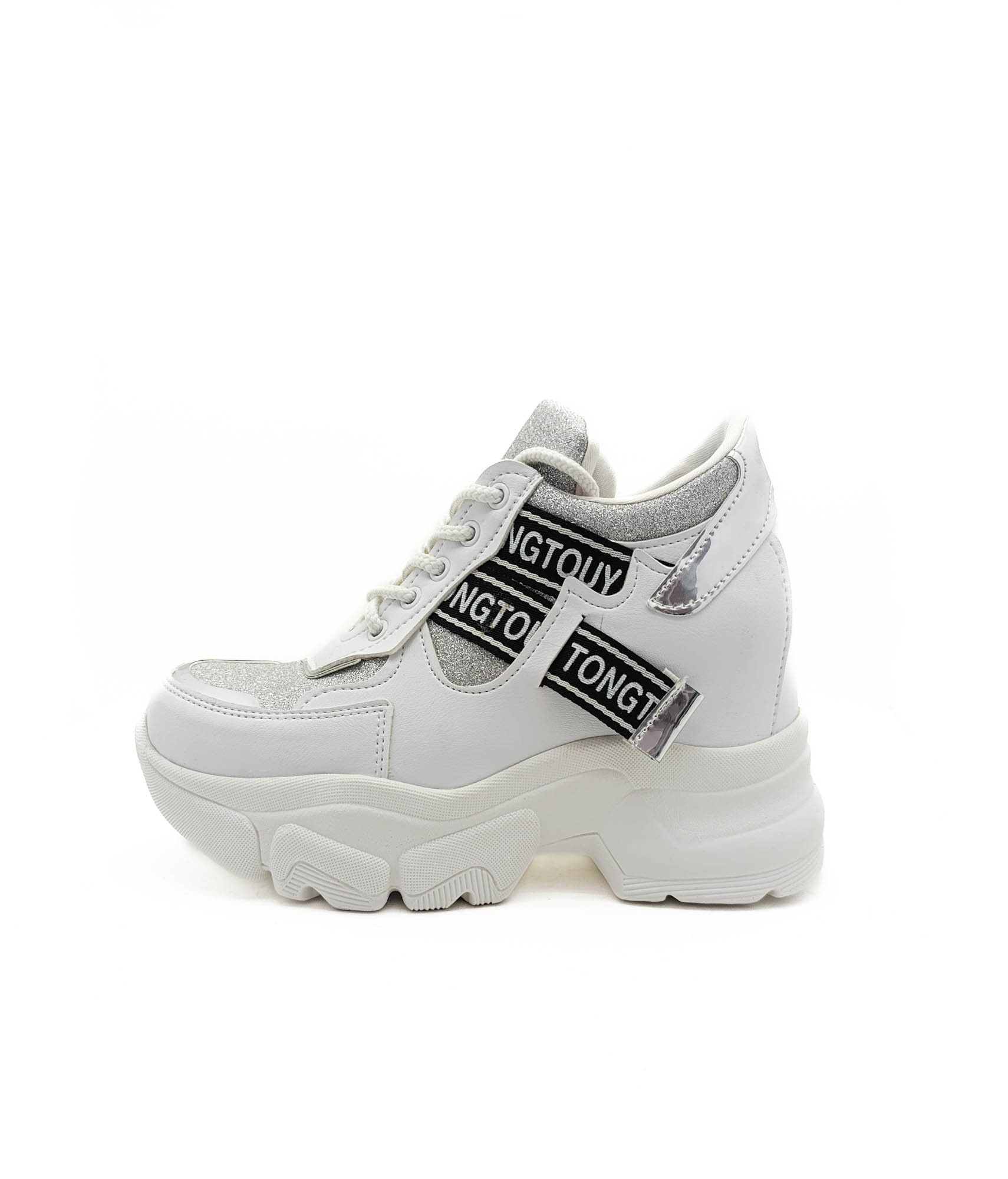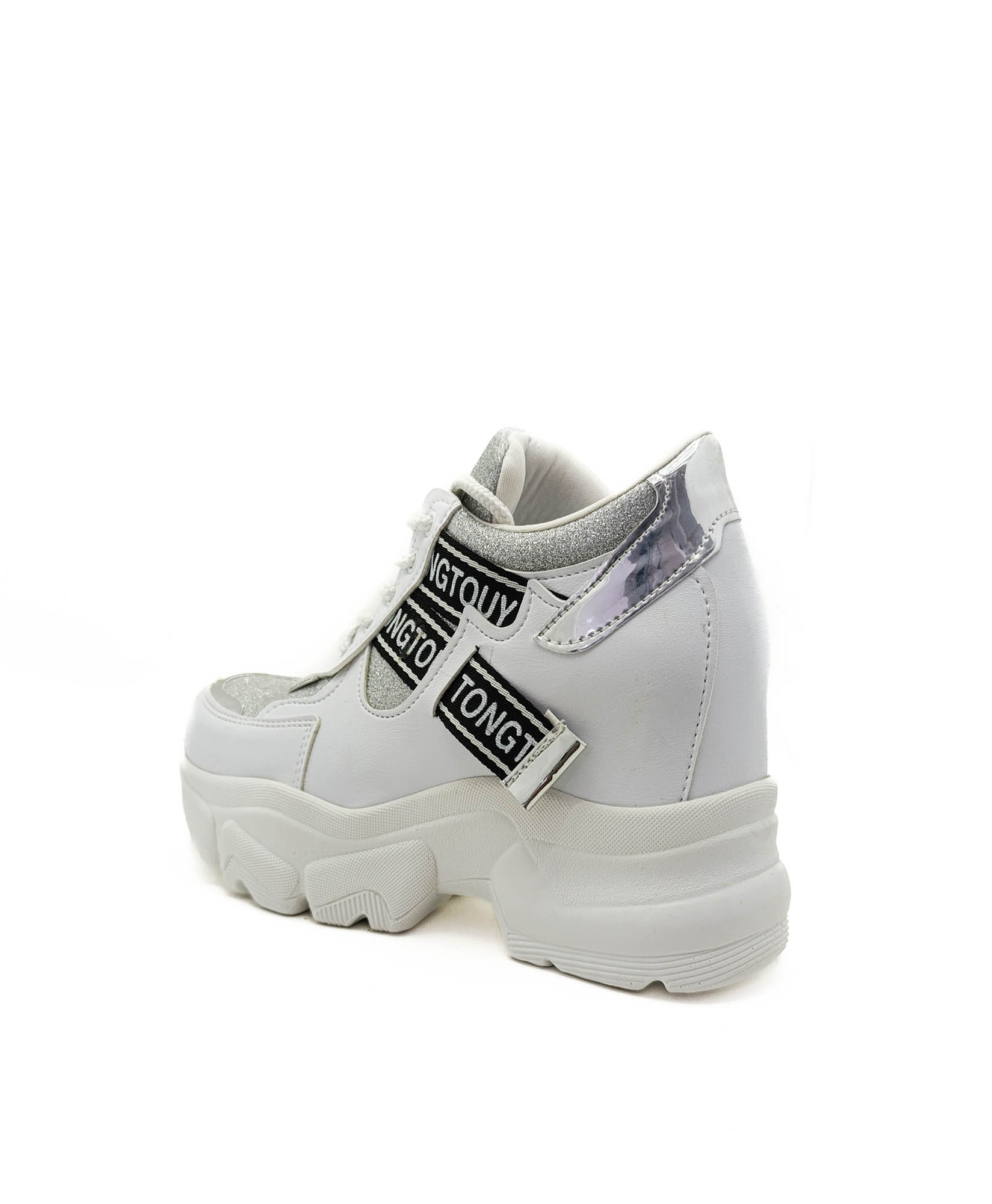 Beyaz Renk Gümüş Simli Cilt Gizli Dolgu Topuk 36-40 Numara Kadın Sneakers