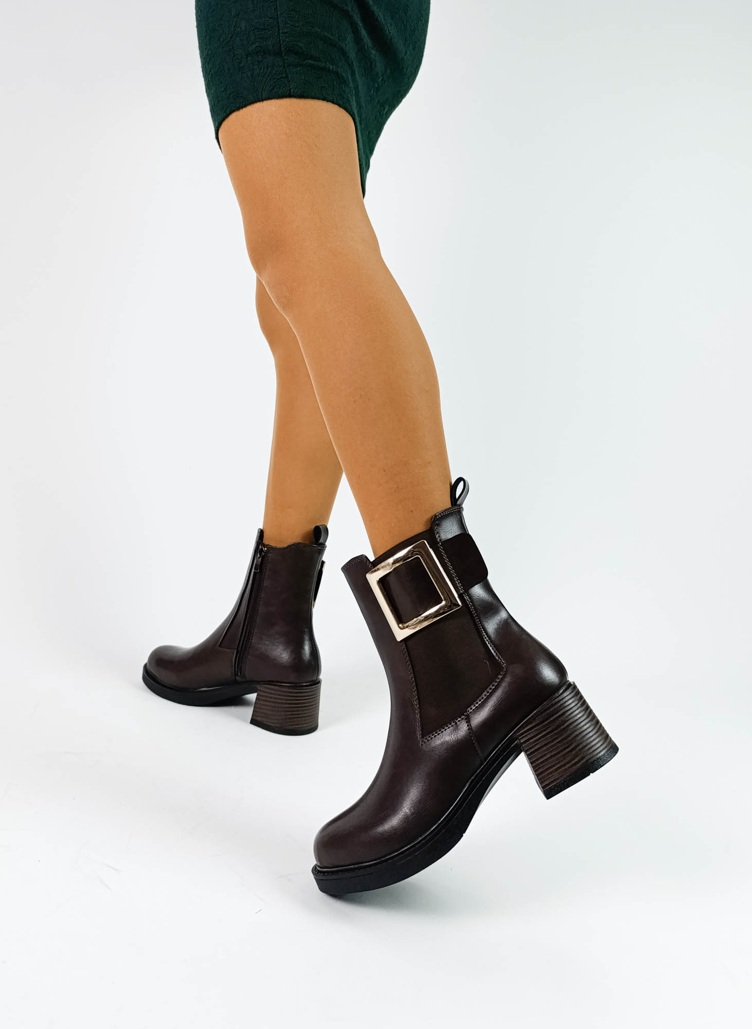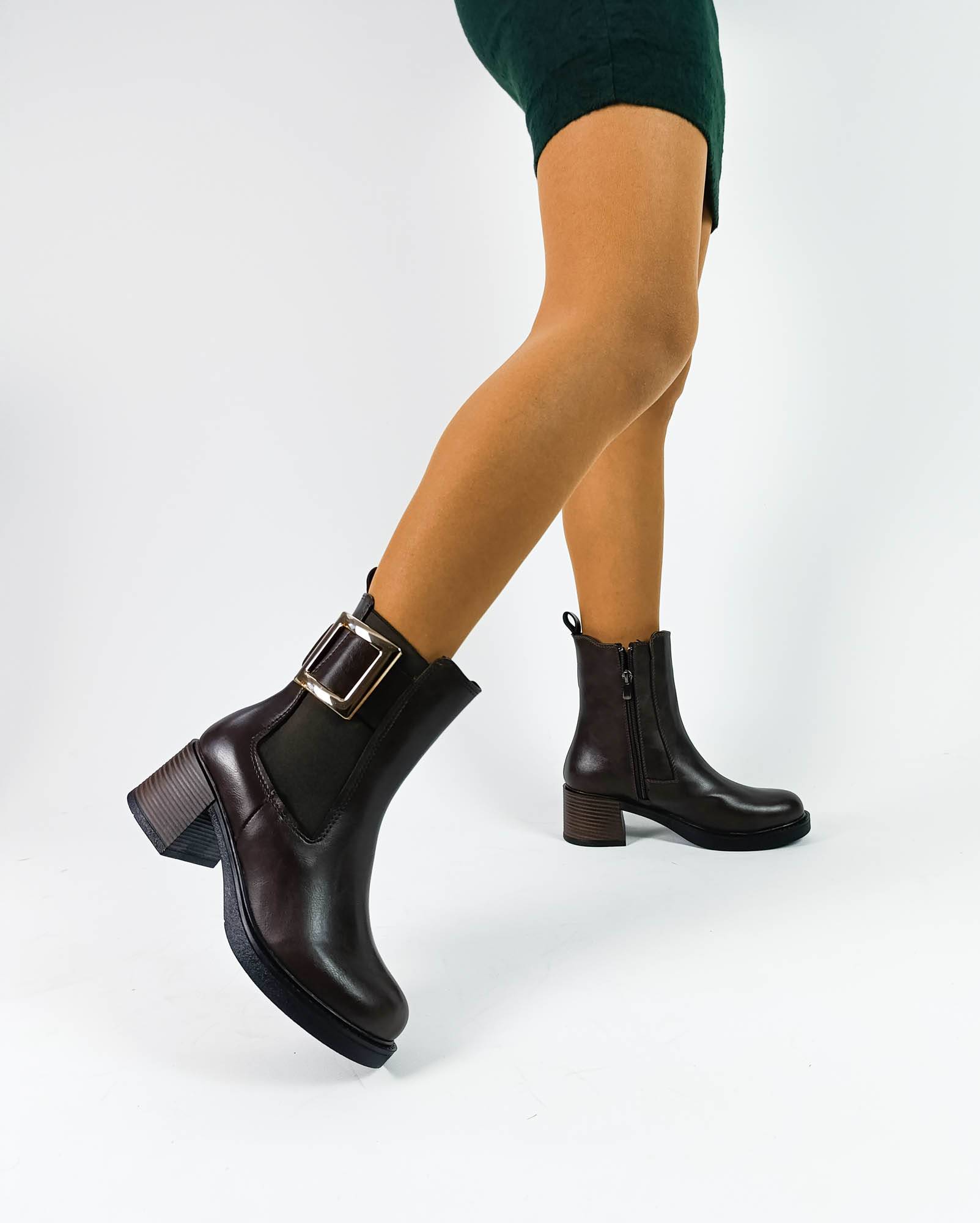 (White Line)Kahve Cilt Tokalı Lastikli Yandan Fermuarlı Kadın Kalın Topuklu Bot