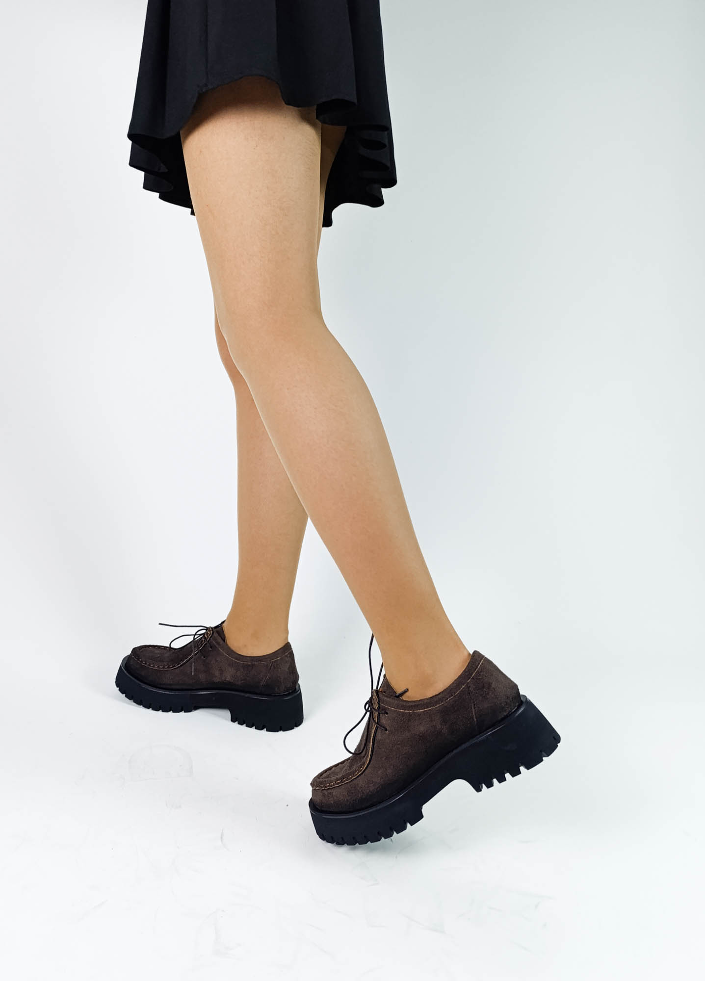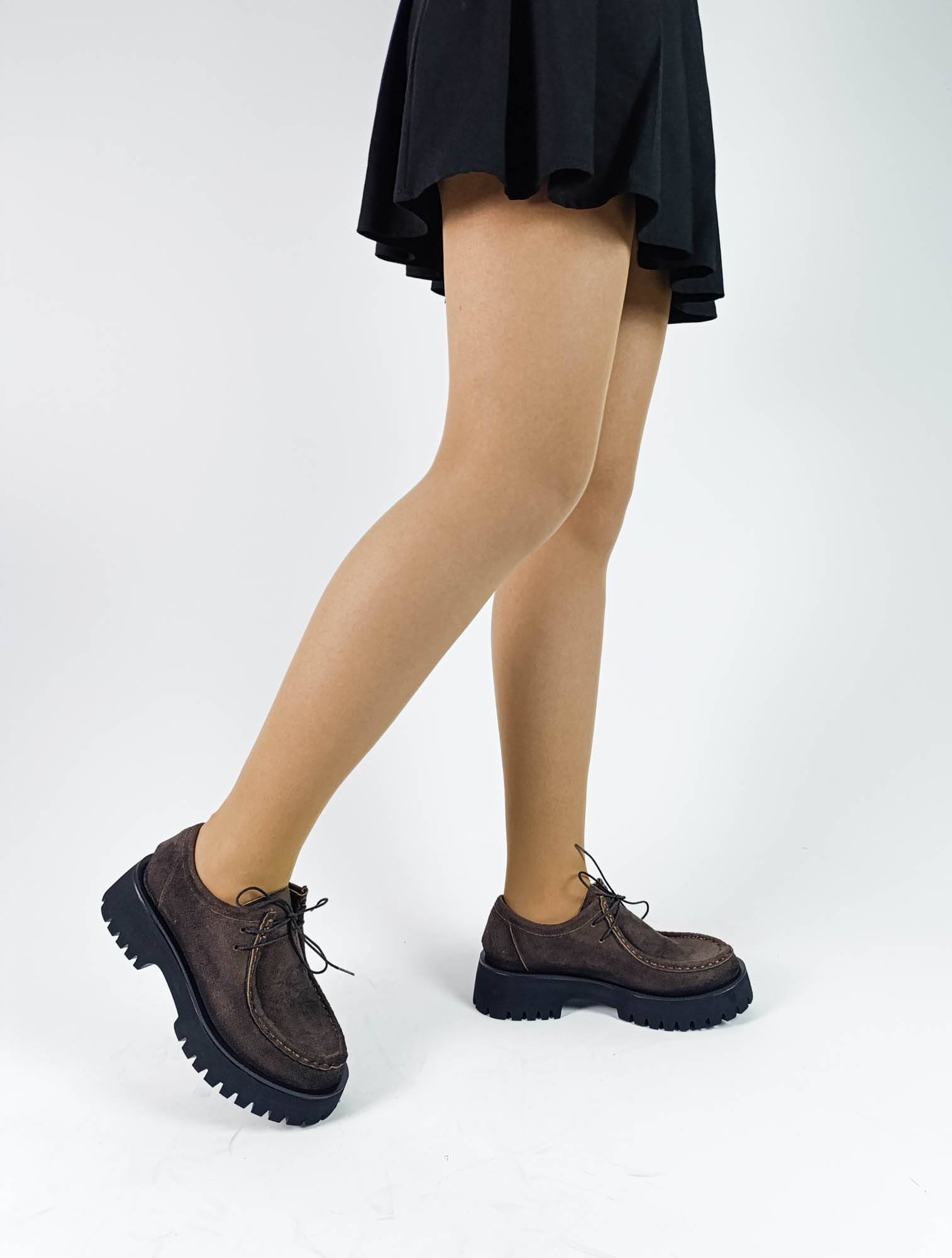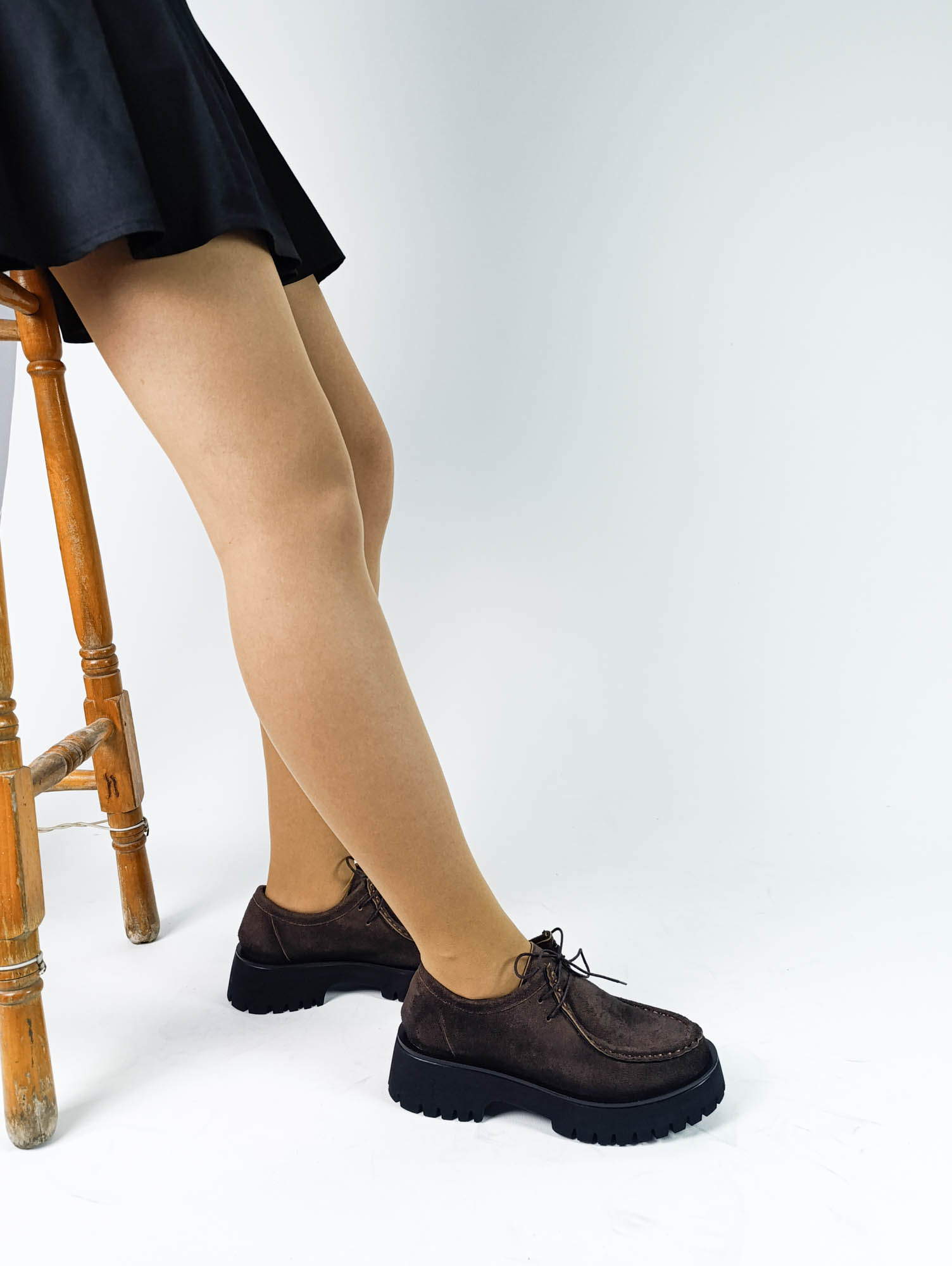 (White Line)Kahve Renk Süet Deri Bağcıklı Kalın Taban Kadın Loafer Ayakkabı