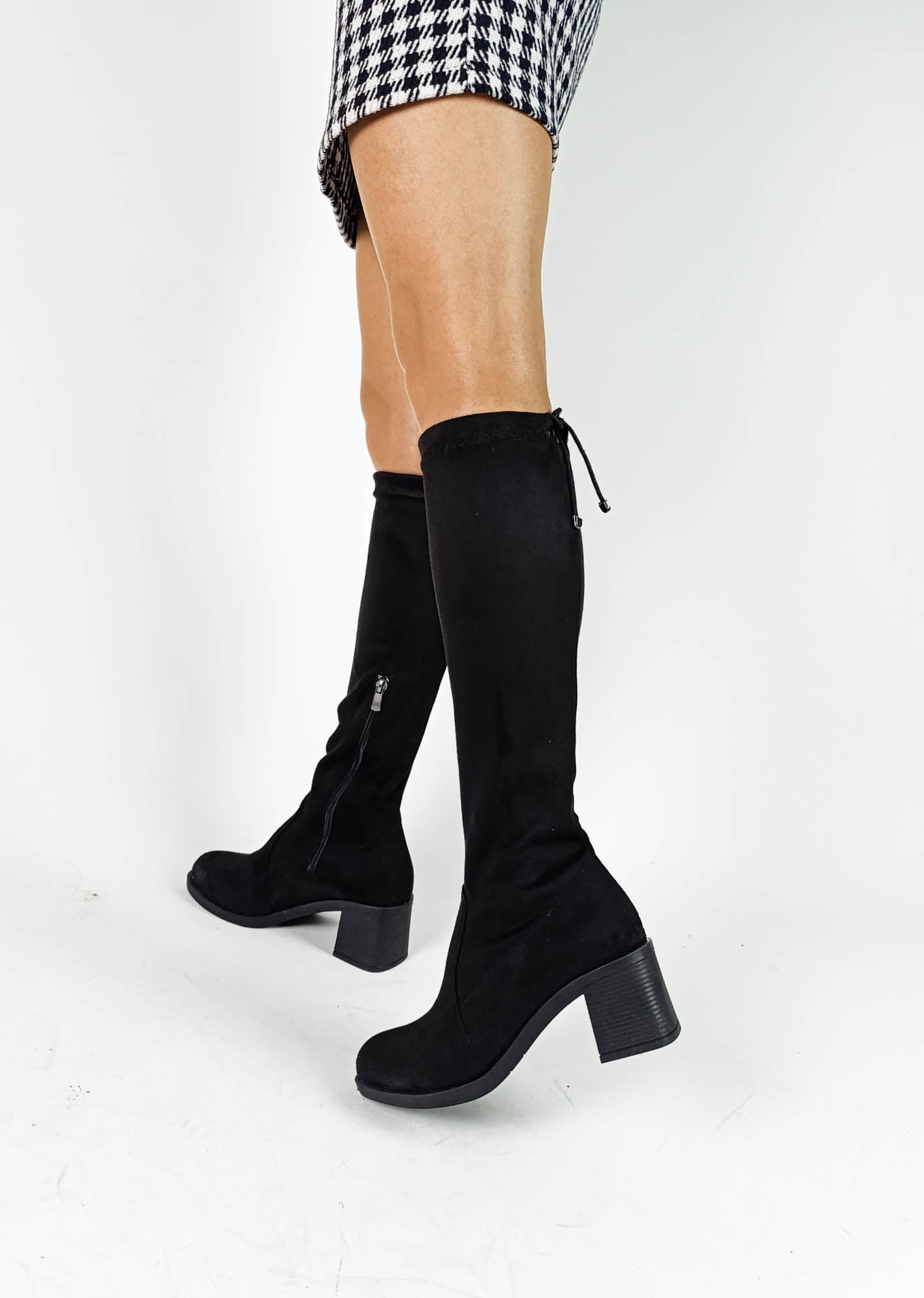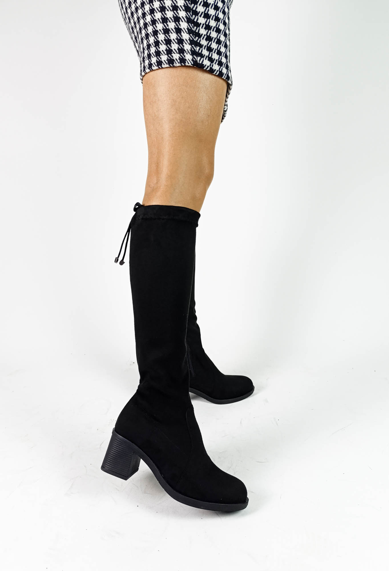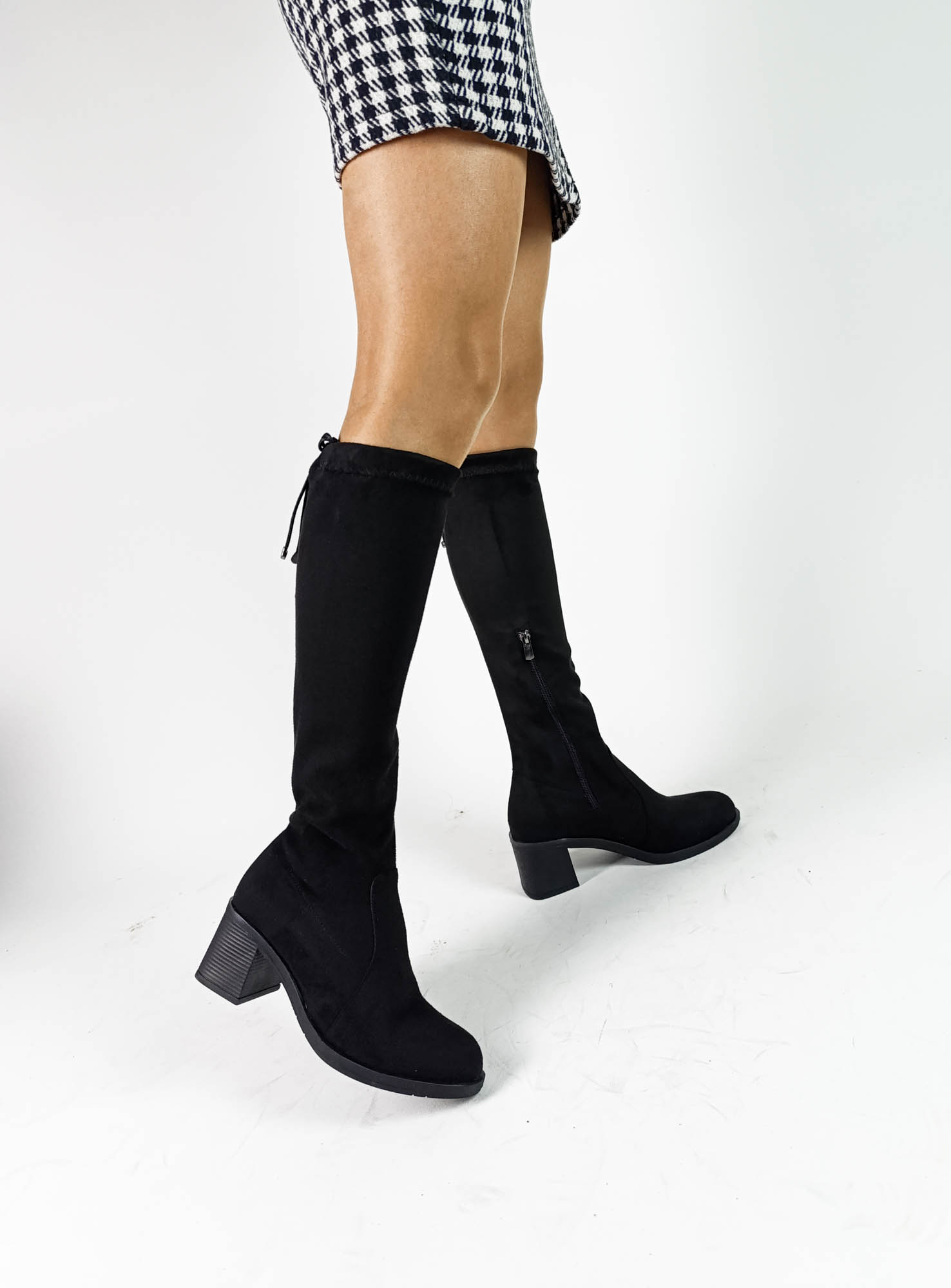 (White Line)Siyah Süet Diz Altı Çorap Streç Kalın Topuk Kadın Çizme