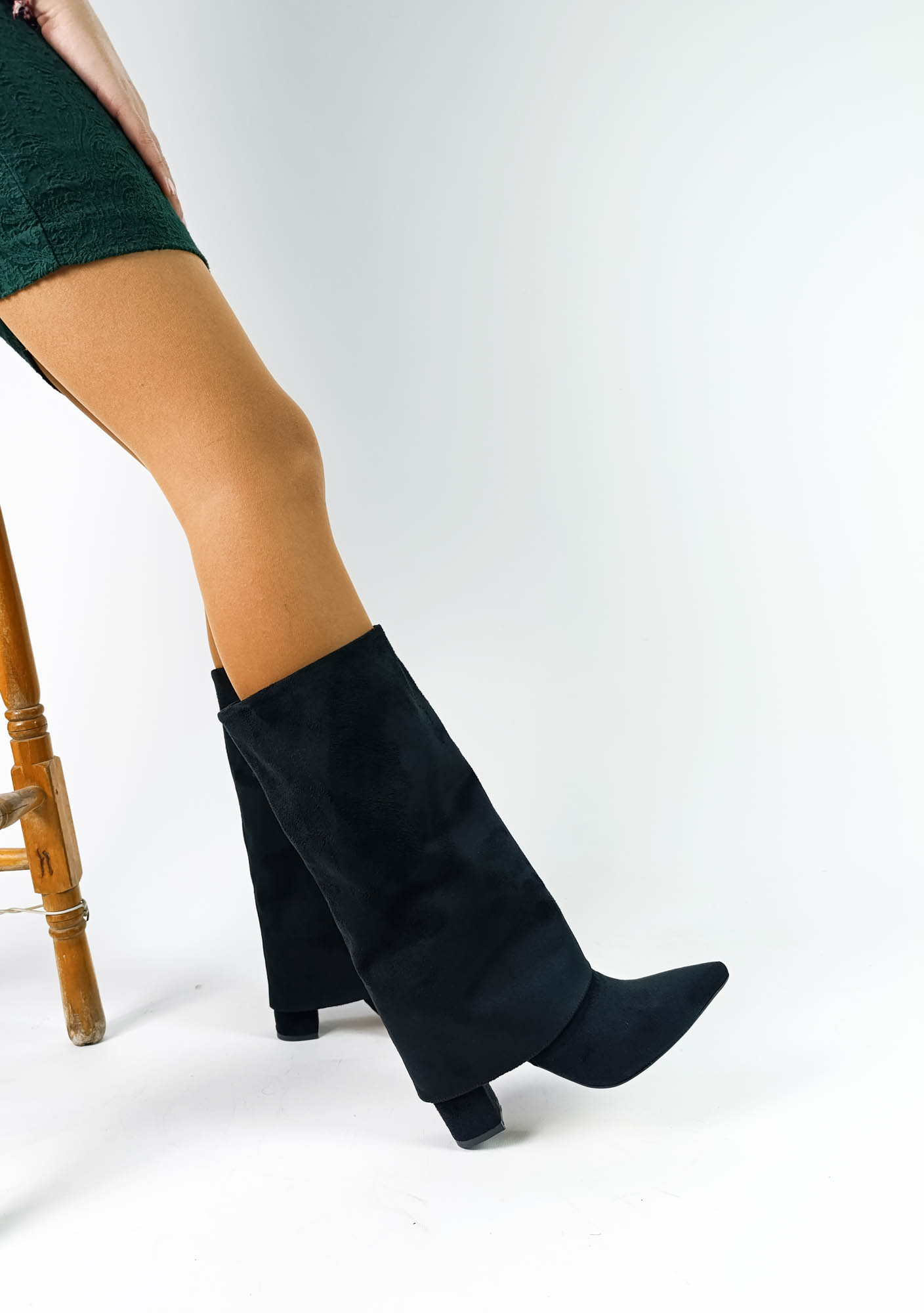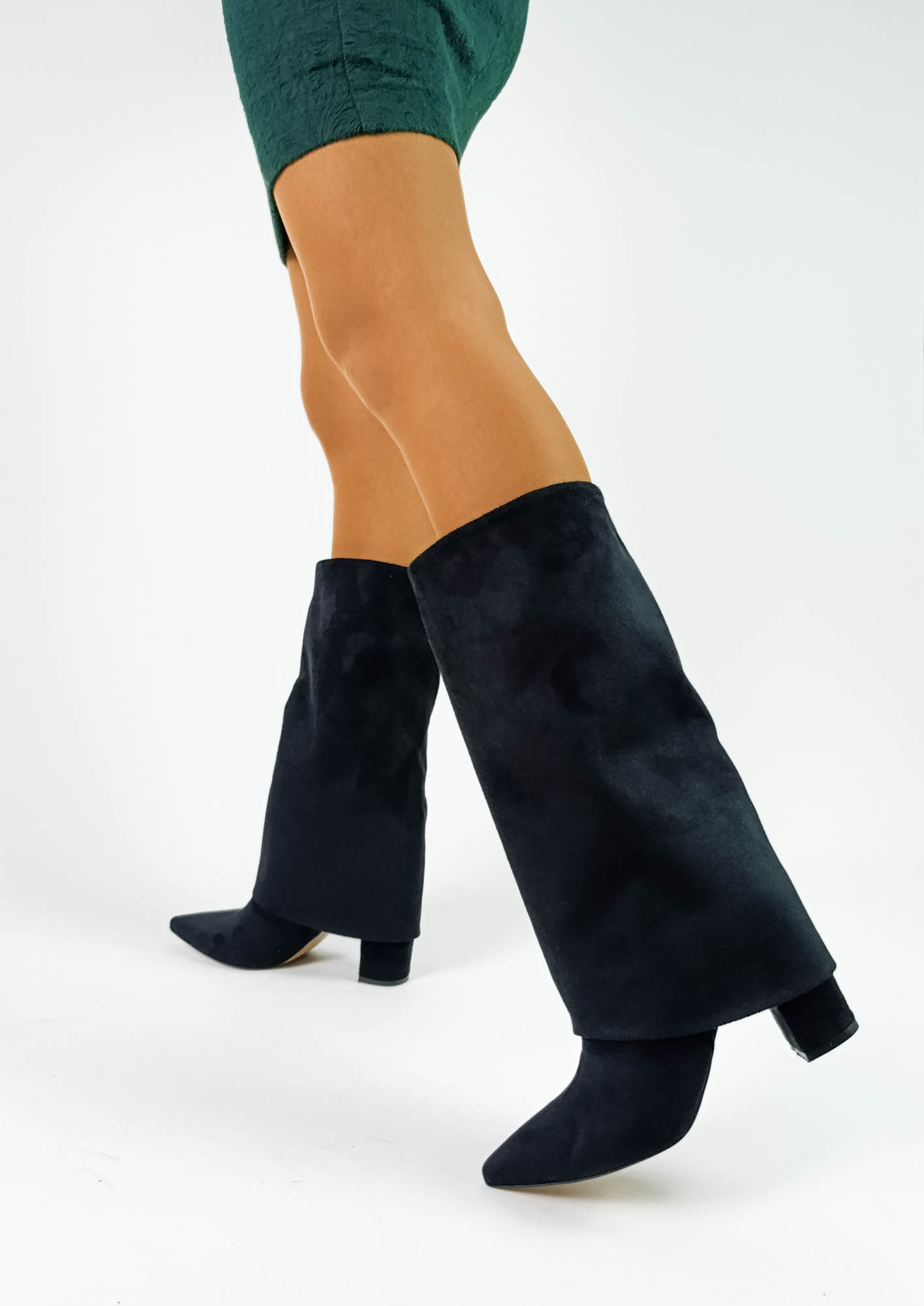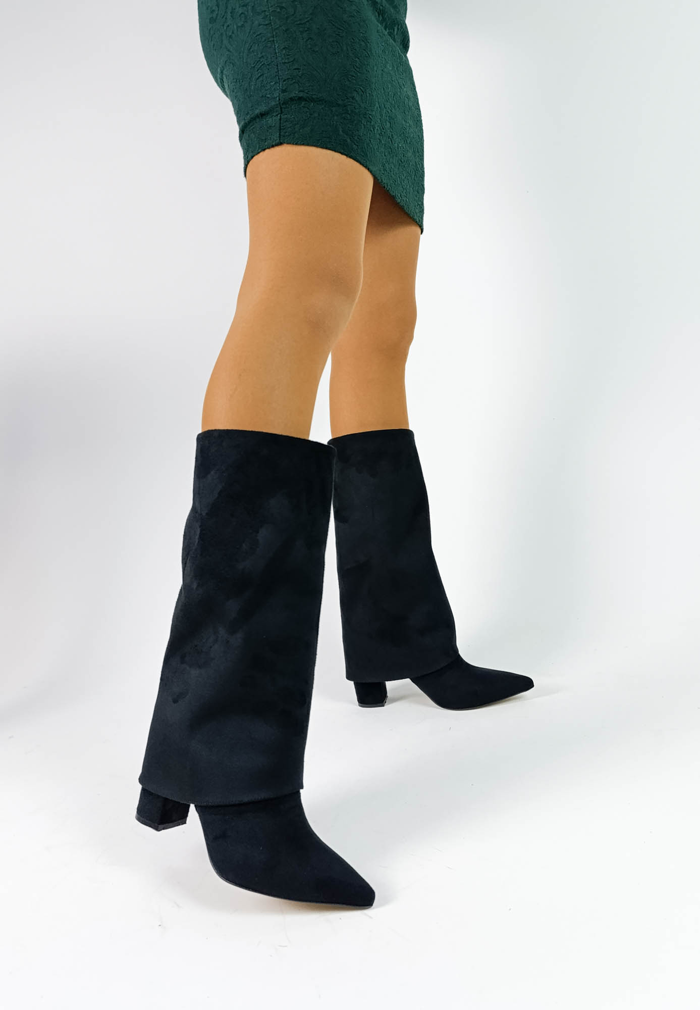 (White Line)Süet Siyah Renk Sivri Burun Kalın Topuk Kadın Çizme